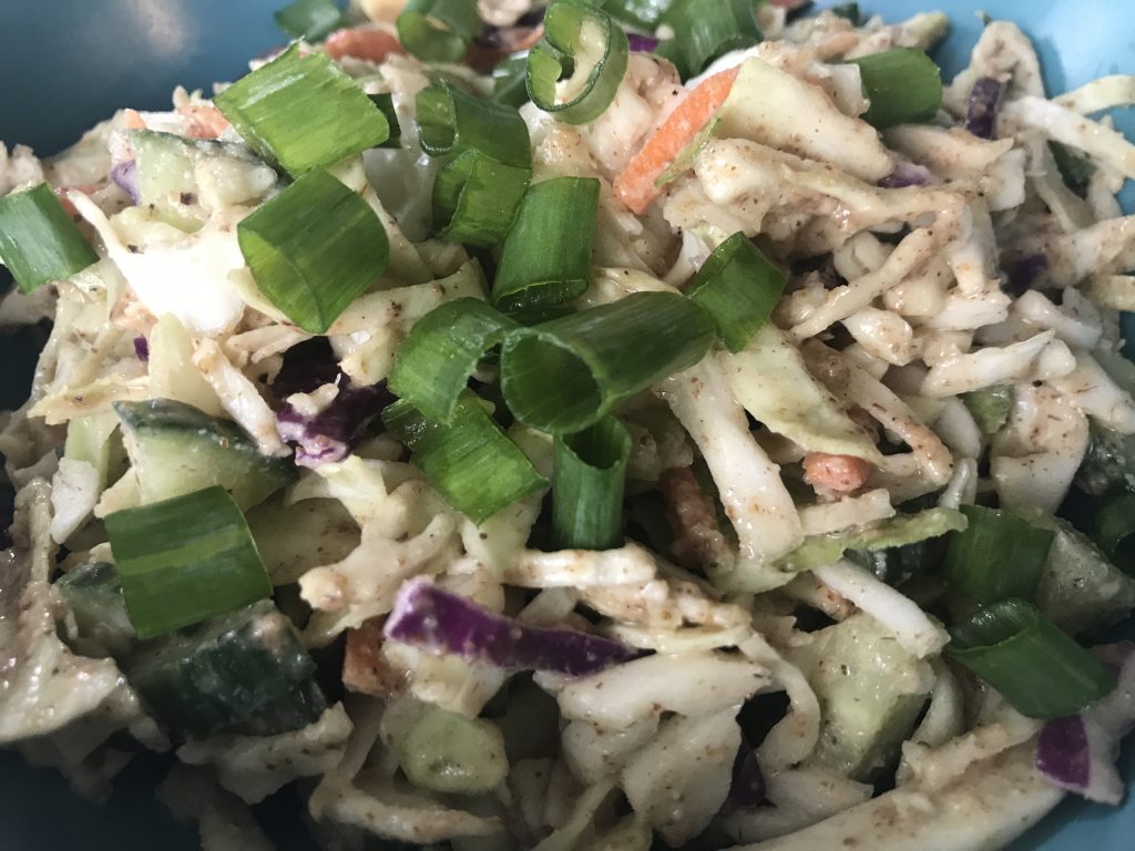 Before I started the AIP diet I ate a very plant forward diet. I used to love Thai Salad with creamy nut based dressing. Yum! I love this salad because it is super filling even without the chicken so if you want a vegetarian or vegan option while on the AIP diet, or you just want more veggies in your life this is a great option. The inspiration for this recipe was High Carb Hannah’s take on the Cheesecake Factory Thai Chicken Salad recipe.